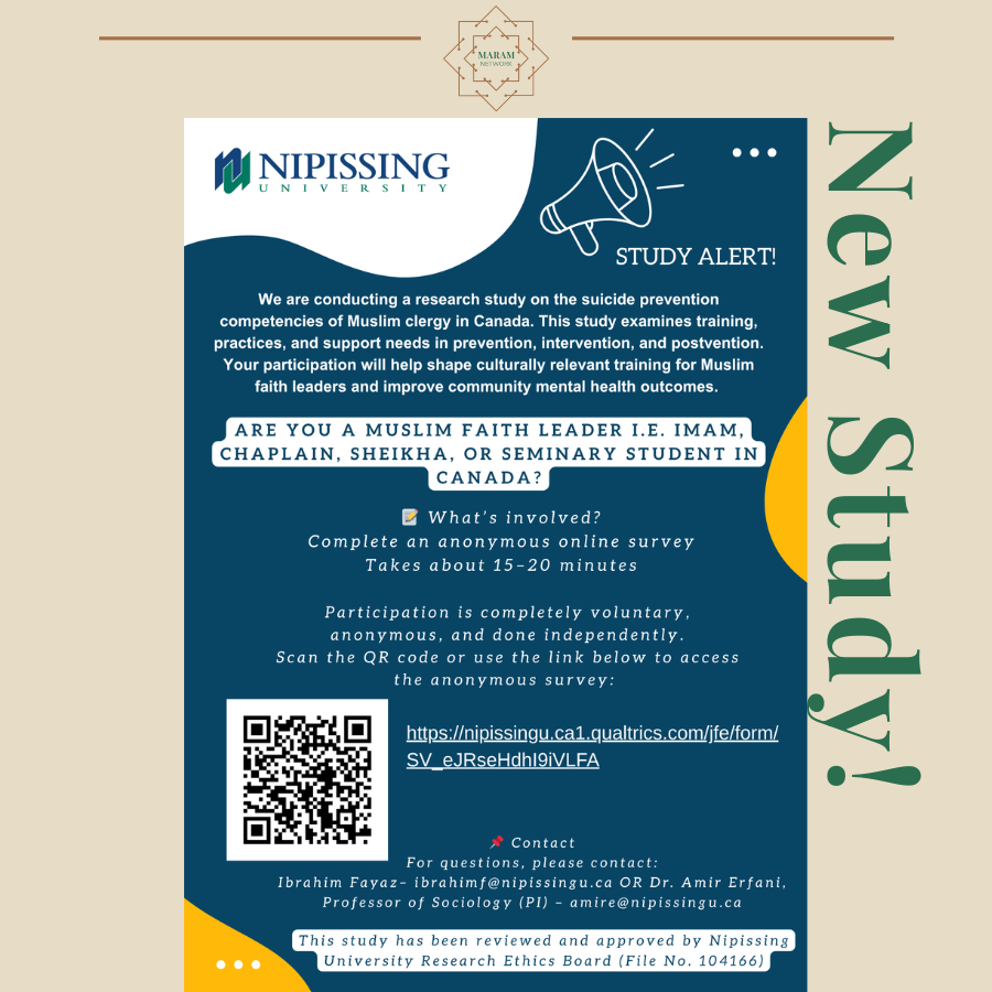 This study exploring the suicide prevention competencies of Muslim faith leaders in Canada, including clergy, Imams, chaplains, and seminary students. The purpose of this study is to better understand the training, practices, and support needs of Muslim religious leaders in relation to suicide prevention, intervention, and postvention in their communities.