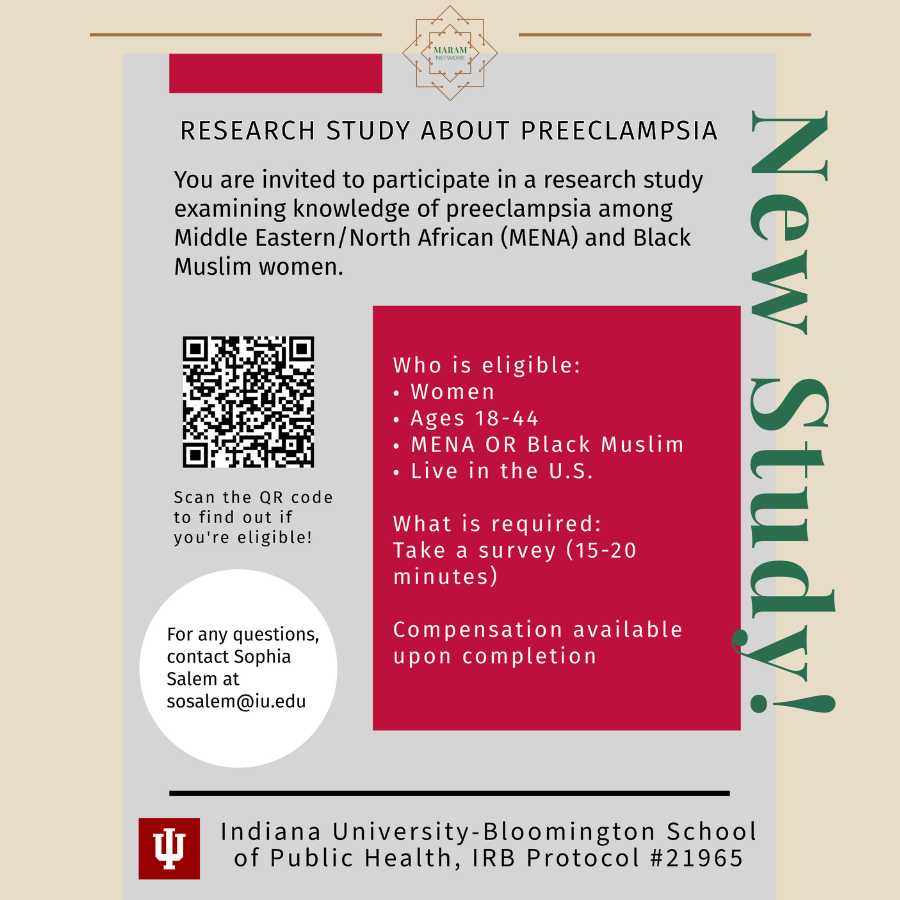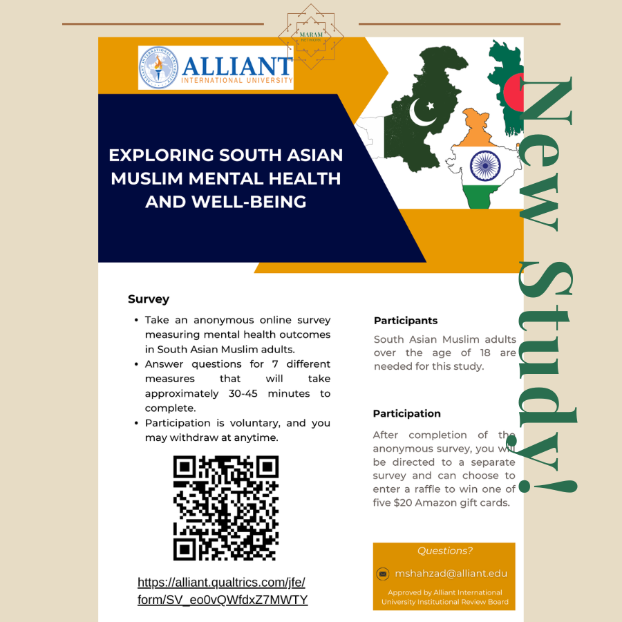 We are conducting an anonymous online survey about how cultural beliefs, internalized stigma, and immigration status (immigrant vs. US born) impact willingness to seek help for postpartum mental health among South Asian Muslim women in the United States. You may participate if you are 18-45, have given birth in the last 12 months, are at least 6 weeks postpartum, and live in the United States. The survey takes about 20-25 minutes, is anonymous, and you may skip any question or stop at any time.