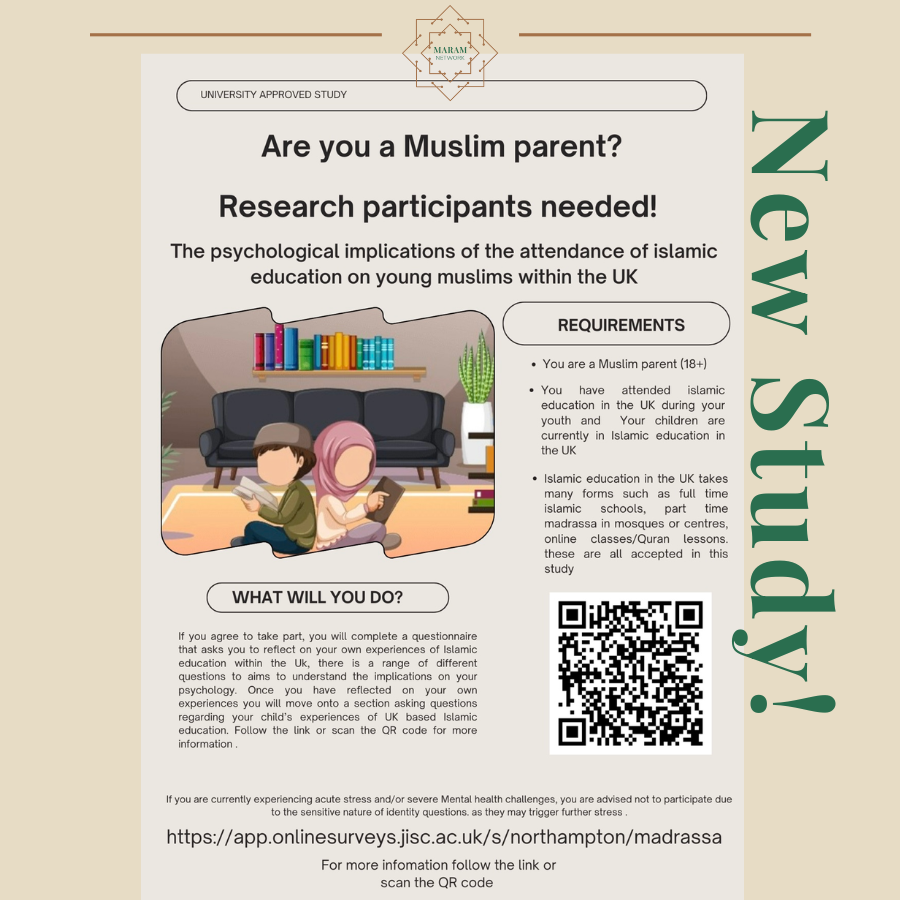 The purpose of the study is to understand the psychological implications that attending Islamic education in the United Kingdom has on youth based on individuals experiences and reflections on their child’s experiences. The goals are to build a strong case around Islamic Education and to increase attendance and understanding of the benefits particularly in a western environment.