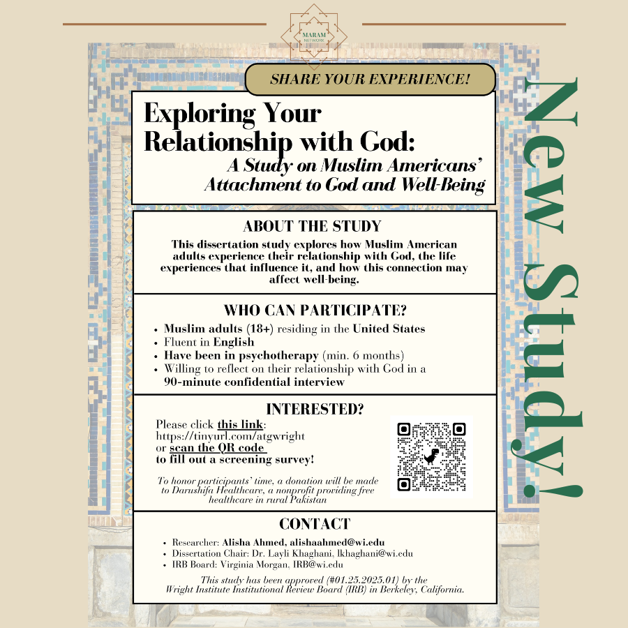 This qualitative study examines how Muslim American adults experience and understand their relationship with God, with a focus on attachment to God as a source of safety, support, and meaning. It explores how early caregiver relationships, psychotherapy, and broader relational and cultural contexts shape experiences of closeness to God over time.